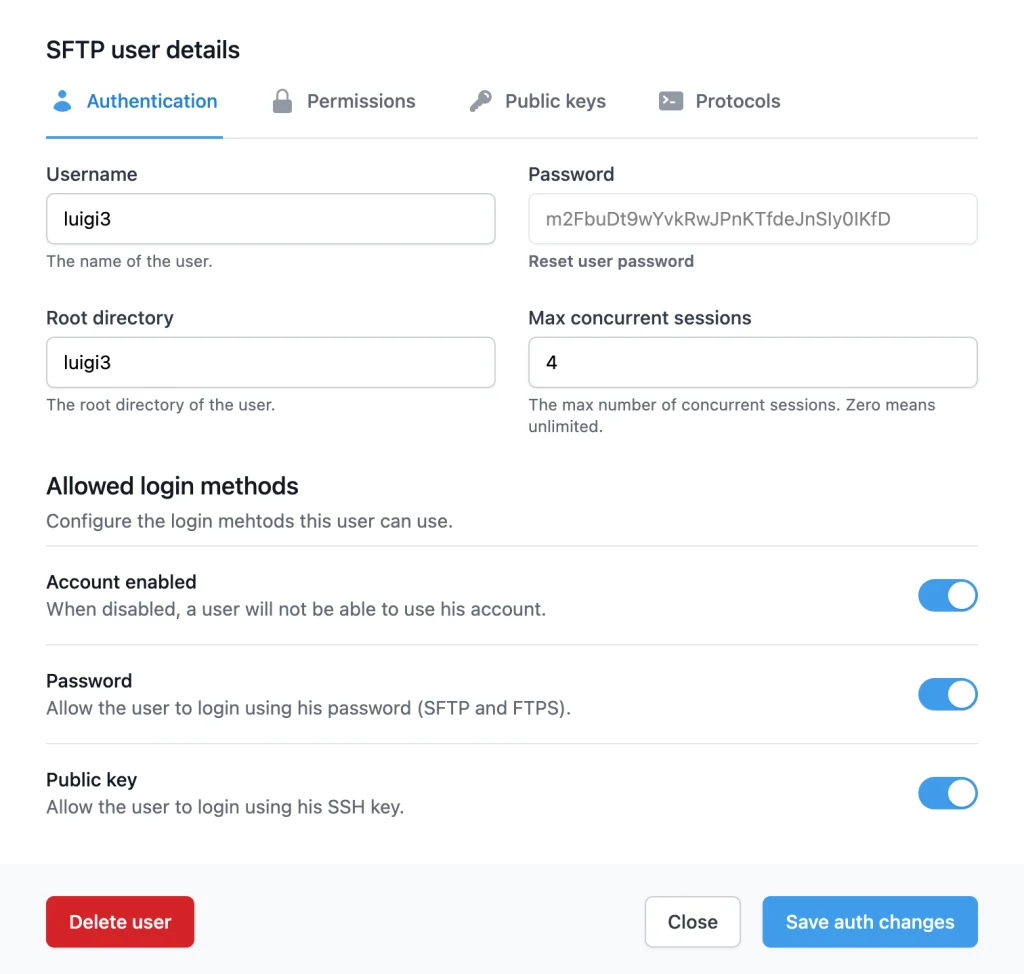 You can easily enable or disable multiple protocols: FTP (File Transfer Protocol) and SFTP (Secure File Transfer Protocol, or or SSH File Transfer Protocol)).